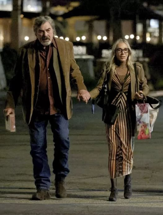 Photos captured the warmth of the evening: hugs goodbye, shared laughter, and a simple but powerful image of Selleck holding a gift in one hand and his wife’s hand in the other. Dressed in dark denim, a maroon shirt, and a tan blazer, he looked relaxed and content. Jillie matched the moment with effortless elegance, wearing a striped, form-fitting dress and a tan coat, a couple comfortable in their own rhythm.